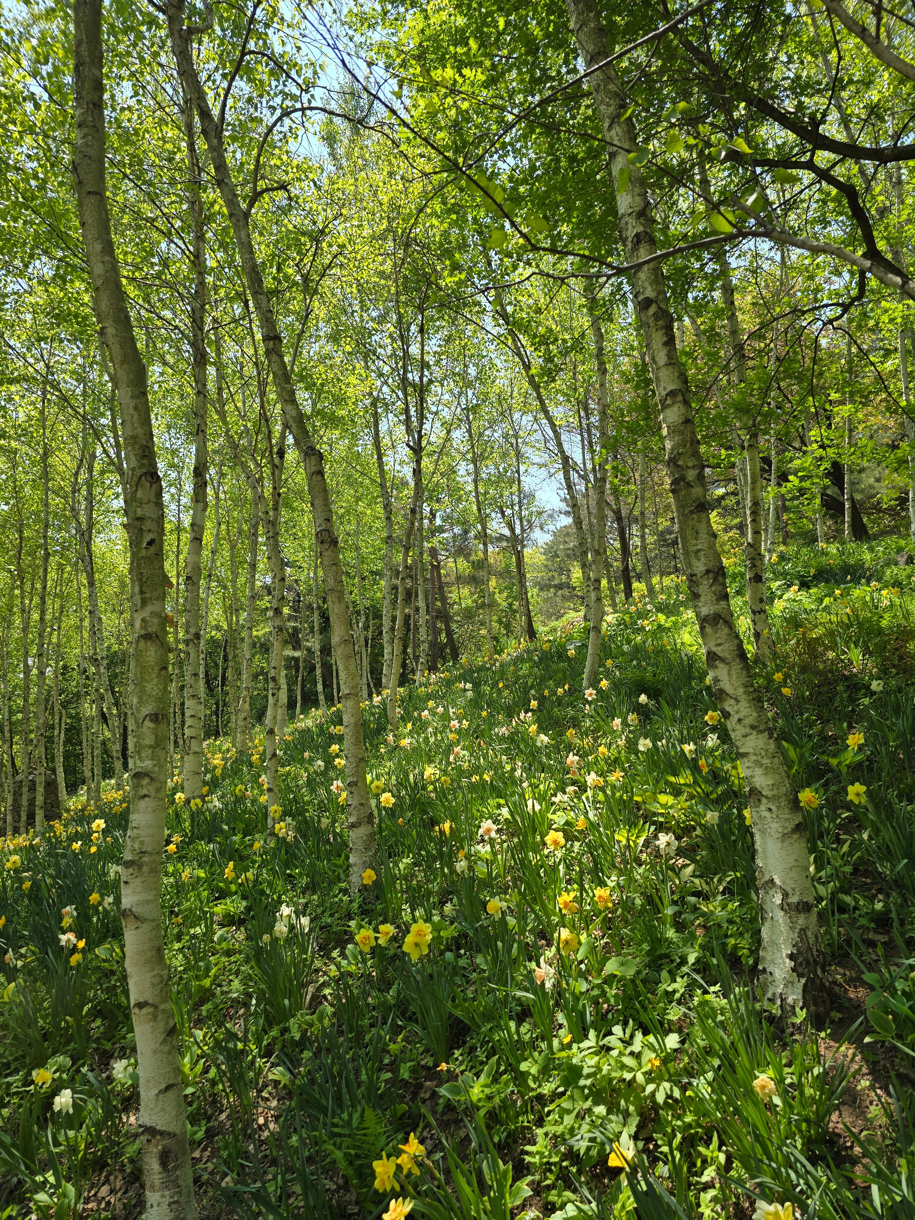 이날 산책의 첫 구간 마지막은 자작나무 숲이었습니다. 하얀 수피의 나무들이 곧게 솟아 있는 이 길은, 봄빛이 스며든 연둣빛 나뭇잎, 수선화, 이름 모를 꽃들이 어우러져 사진 찍기에 완벽한 장소였습니다. 걸음을 멈추고 나무 사이를 바라보면 숲의 고요함 속에서 자연과 하나 되는 기분을 느낄 수 있었어요.