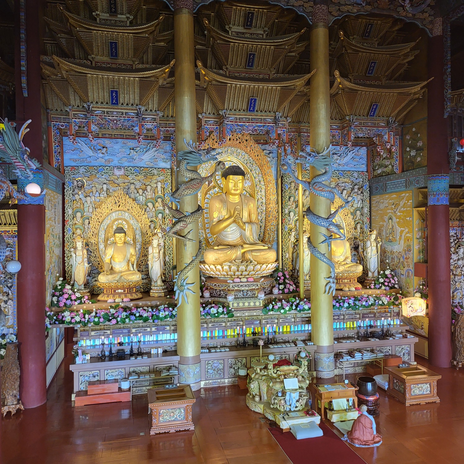 불상과 불전이 엄청 크고 화려해요. 기둥에 있는 용들도 멋져요. 화려하다고 엄숙하지 않은 것은 아니었어요. 기도하시는 분들도 많았어요.